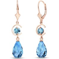 Blue Topaz Leverback Earrings handcrafted in rose gold plated 9ct gold. Four gemstones, total 11 ct for both earrings combined. Briolette cut. Size: 7.9 x 41.1 mm (0.31 x 1.62 in). Material: 9ct Rose Gold. Total metal weight: 3.1 gr. 2 briolette cut blue topaz (12 x 8 mm) = 10 ct total for pair. 2 round cut blue topaz (5 x 5 mm) = 1 ct total for pair. Colour: Blue. Stone cut: Briolette Cut. Anniversary: 4th Anniversary. Birthstone: November.