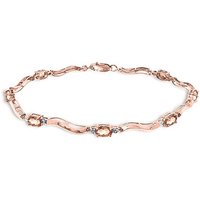 Citrine & Diamond Tennis Bracelet handcrafted in rose gold plated 9ct gold. Seven genuine citrines, total 2 ct, two diamonds, total 0.01 ct. Oval cut. Fastened by rose gold lobster clasp. Fits wrist up to 8.5″. Size: 4.3 mm (0.17 in). Material: 9ct Rose Gold. Total metal weight: 3.3 gr. 7 oval cut citrines (5 x 3 mm) = 2 ct total. 2 round cut diamonds (K colour, SI1 clarity) = 0.01 ct total. Colour: Orange. Stone cut: Oval Cut. Anniversary: 13th Anniversary. Birthstone: November.