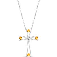 Citrine & Diamond Cross Pendant Necklace handcrafted in solid white gold. Four genuine citrines, total 0.4 ct, single 0.03 ct diamond. Round cut. The pendant hangs from a white gold double link rope chain with spring clasp. Size: 20.3 x 30 mm (0.8 x 1.18 in). Material: 9ct White Gold. Total metal weight: 1.24 gr. 4 round cut citrines = 0.4 ct total. 1 round brilliant cut diamond (H colour, SI2 clarity) = 0.03 ct. Colour: Orange. Stone cut: Round Cut. Anniversary: 13th Anniversary. Birthstone: November.