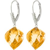 Citrine & Diamond Leverback Earrings handcrafted in solid white gold. Two genuine citrines, total 23.5 ct, ten diamonds, total 0.15 ct for both earrings combined. Twisted briolette cut. Size: 12.7 x 32.5 mm (0.5 x 1.28 in). Material: 9ct White Gold. Total metal weight: 4.8 gr. 2 twisted briolette cut citrines (15 x 13 mm) = 23.5 ct total for pair. 10 round cut diamonds (K colour, I3 clarity) = 0.15 ct total for pair. Colour: Orange. Stone cut: Twisted Briolette Cut. Anniversary: 13th Anniversary. Birthstone: November.