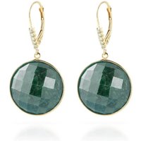 Corundum & Diamond Leverback Earrings handcrafted in solid gold. Two genuine corundum, total 46 ct, ten diamonds, total 0.15 ct for both earrings combined. Round cut. Size: 18.5 x 36.6 mm (0.73 x 1.44 in). Material: 9ct Gold. Total metal weight: 9.9 gr. 2 round cut corundum = 46 ct total for pair. 10 round cut diamonds (G colour, SI2 clarity) = 0.15 ct total for pair. Colour: Green. Stone cut: Round Cut.