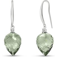 Green Amethyst & Diamond Fish Hook Earrings handcrafted in solid white gold. Two genuine amethysts, total 19 ct, two diamonds, total 0.1 ct for both earrings combined. Pointed briolette cut. Size: 10.2 x 34.8 mm (0.4 x 1.37 in). Material: 9ct White Gold. Total metal weight: 4.0 gr. 2 pointed briolette cut green amethysts (15 x 10 mm) = 19 ct total for pair. 2 round cut diamonds (K colour, I3 clarity) = 0.1 ct total for pair. Colour: Green. Stone cut: Pointed Briolette Cut. Anniversary: 6th Anniversary. Birthstone: February.