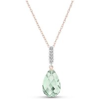 Green Amethyst & Diamond Pendant Necklace handcrafted in rose gold plated 9ct gold. Single 5.3 ct genuine amethyst, five diamonds, total 0.08 ct. Briolette cut. The pendant is suspended from a rose gold double link rope chain with spring clasp. Size: 7.9 x 24.4 mm (0.31 x 0.96 in). Material: 9ct Rose Gold. Total metal weight: 2.64 gr. 1 briolette cut green amethyst = 5.3 ct. 5 round cut diamonds (K colour, I3 clarity) = 0.08 ct total. Colour: Green. Stone cut: Briolette Cut. Anniversary: 6th Anniversary. Birthstone: February.
