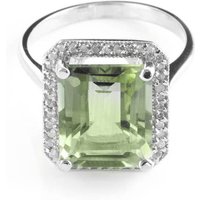 Green Amethyst & Diamond Ring handcrafted in solid sterling silver. Single 5.6 ct genuine amethyst, 40 diamonds, total 0.2 ct. Emerald cut. Available from sizes H to Z including half sizes. Size: 15.7 mm (0.62 in). Material: Sterling Silver. Total metal weight: 4.3 gr. 1 emerald cut green amethyst (12 x 10 mm) = 5.6 ct. 40 round cut diamonds (K colour, I3 clarity) = 0.2 ct total. Colour: Green. Stone cut: Emerald Cut. Anniversary: 6th Anniversary. Birthstone: February.