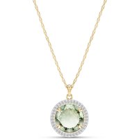 Green Amethyst & Diamond Pendant Necklace handcrafted in solid gold. Single 5 ct genuine amethyst, 36 diamonds, total 0.2 ct. Round cut. The pendant hangs from a gold double link rope chain with spring clasp. Size: 16.3 x 24.6 mm (0.64 x 0.97 in). Material: 9ct Gold. Total metal weight: 3.64 gr. 1 round cut green amethyst (12 x 12 mm) = 5 ct. 36 round cut diamonds (K colour, I3 clarity) = 0.2 ct total. Colour: Green. Stone cut: Round Cut. Anniversary: 6th Anniversary. Birthstone: February.