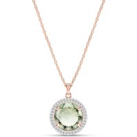 Green Amethyst & Diamond Pendant Necklace handcrafted in rose gold plated 9ct gold. Single 5 ct genuine amethyst, 36 diamonds, total 0.2 ct. Round cut. The pendant hangs from a rose gold double link rope chain with spring clasp. Size: 16.3 x 24.6 mm (0.64 x 0.97 in). Material: 9ct Rose Gold. Total metal weight: 3.64 gr. 1 round cut green amethyst (12 x 12 mm) = 5 ct. 36 round cut diamonds (K colour, I3 clarity) = 0.2 ct total. Colour: Green. Stone cut: Round Cut. Anniversary: 6th Anniversary. Birthstone: February.