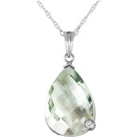 Green Amethyst & Diamond Pendant Necklace handcrafted in solid white gold. Single 5 ct genuine amethyst, single 0.04 ct diamond. Briolette cut. The pendant hangs from a white gold double link rope chain with spring clasp. Size: 11.2 x 22.4 mm (0.44 x 0.88 in). Material: 9ct White Gold. Total metal weight: 2.14 gr. 1 briolette cut green amethyst (15 x 10 mm) = 5 ct. 1 round brilliant cut diamond (G colour, SI2 clarity) = 0.04 ct. Colour: Green. Stone cut: Briolette Cut. Anniversary: 6th Anniversary. Birthstone: February.