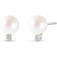 Pearl & Diamond Stud Earrings handcrafted in solid white gold. Two genuine pearls, total 4 ct, two diamonds, total 0.1 ct for both earrings combined. Post with friction back to fasten. Size: 7.1 x 8.9 mm (0.28 x 0.35 in). Material: 9ct White Gold. Total metal weight: 1.4 gr. 2 freshwater pearls (7 x 7 mm) = 4 ct total for pair. 2 round cut diamonds (K colour, I3 clarity) = 0.1 ct total for pair. Colour: White. Anniversary: 3rd Anniversary, 30th Anniversary. Birthstone: June.
