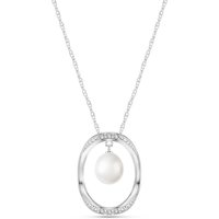 Pearl & Diamond Pendant Necklace handcrafted in solid white gold. Single 4 ct genuine pearl, six diamonds, total 0.1 ct. The pendant is suspended from a white gold double link rope chain with spring clasp. Size: 19.1 x 25.4 mm (0.75 x 1 in). Material: 9ct White Gold. Total metal weight: 4.44 gr. 1 freshwater pearl (10 x 8 mm) = 4 ct. 6 round cut diamonds (G colour, SI1 clarity) = 0.1 ct total. Colour: White. Anniversary: 3rd Anniversary, 30th Anniversary. Birthstone: June.