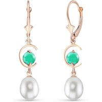 Pearl & Emerald Leverback Earrings handcrafted in rose gold plated 9ct gold. Four gemstones, total 9 ct for both earrings combined. Size: 7.9 x 39.6 mm (0.31 x 1.56 in). Material: 9ct Rose Gold. Total metal weight: 3.0 gr. 2 freshwater pearls (10 x 8 mm) = 8 ct total for pair. 2 round cut emeralds (5 x 5 mm) = 1 ct total for pair. Colour: White. Anniversary: 3rd Anniversary, 30th Anniversary. Birthstone: June.