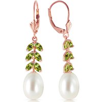 Pearl & Peridot Leverback Earrings handcrafted in rose gold plated 9ct gold. 14 gemstones, total 9.2 ct for both earrings combined. Size: 7.9 x 39.9 mm (0.31 x 1.57 in). Material: 9ct Rose Gold. Total metal weight: 3.5 gr. 2 freshwater pearls (10 x 8 mm) = 8 ct total for pair. 12 marquise cut peridots (4 x 2 mm) = 1.2 ct total for pair. Colour: White. Anniversary: 3rd Anniversary, 30th Anniversary. Birthstone: June.