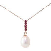 Pearl & Ruby Pendant Necklace handcrafted in rose gold plated 9ct gold. Six gemstones, total 4.2 ct. The pendant hangs from a rose gold double link rope chain with spring clasp. Size: 7.9 x 22.9 mm (0.31 x 0.9 in). Material: 9ct Rose Gold. Total metal weight: 2.64 gr. 1 freshwater pearl (10 x 8 mm) = 4 ct. 5 round cut rubies (1.5 x 1.5 mm, VS1 clarity) = 0.2 ct total. Colour: White. Anniversary: 3rd Anniversary, 30th Anniversary. Birthstone: June.