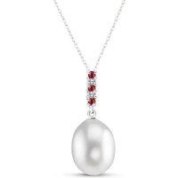 Pearl, Ruby & Diamond Pendant Necklace handcrafted in solid white gold. Four gemstones, total 4.12 ct, two diamonds, total 0.03 ct. The pendant hangs from a white gold double link rope chain with spring clasp. Size: 7.9 x 22.9 mm (0.31 x 0.9 in). Material: 9ct White Gold. Total metal weight: 2.64 gr. 1 freshwater pearl = 4 ct. 3 round cut rubies (VS1 clarity) = 0.12 ct total. 2 round cut diamonds (K colour, I3 clarity) = 0.03 ct total. Colour: White. Anniversary: 3rd Anniversary, 30th Anniversary. Birthstone: June.