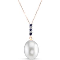 Pearl, Sapphire & Diamond Pendant Necklace handcrafted in rose gold plated 9ct gold. Four gemstones, total 4.12 ct, two diamonds, total 0.03 ct. The pendant is suspended from a rose gold double link rope chain with spring clasp. Size: 7.9 x 22.9 mm (0.31 x 0.9 in). Material: 9ct Rose Gold. Total metal weight: 2.64 gr. 1 freshwater pearl = 4 ct. 3 round cut sapphires = 0.12 ct total. 2 round cut diamonds (K colour, I3 clarity) = 0.03 ct total. Colour: White. Anniversary: 3rd Anniversary, 30th Anniversary. Birthstone: June.