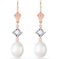 Pearl & White Topaz Leverback Earrings handcrafted in rose gold plated 9ct gold. Four gemstones, total 9 ct for both earrings combined. Size: 7.9 x 35.6 mm (0.31 x 1.4 in). Material: 9ct Rose Gold. Total metal weight: 2.7 gr. 2 freshwater pearls (10 x 8 mm) = 8 ct total for pair. 2 square cut white topaz (4 x 4 mm) = 1 ct total for pair. Colour: White. Anniversary: 3rd Anniversary, 30th Anniversary. Birthstone: June.