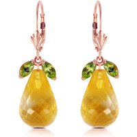 Peridot & Citrine Leverback Earrings handcrafted in rose gold plated 9ct gold. Six gemstones, total 14.4 ct for both earrings combined. Marquise cut. Size: 10.2 x 33 mm (0.4 x 1.3 in). Material: 9ct Rose Gold. Total metal weight: 3.9 gr. 4 marquise cut peridots (6 x 3 mm) = 1 ct total for pair. 2 briolette cut citrines (12 x 8 mm) = 13.4 ct total for pair. Colour: Green. Stone cut: Marquise Cut. Anniversary: 16th Anniversary. Birthstone: August.