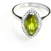 Peridot & Diamond Ring handcrafted in solid sterling silver. Single 2 ct genuine peridot, 30 diamonds, total 0.15 ct. Marquise cut. Available from sizes H to Z including half sizes. Size: 16.3 mm (0.64 in). Material: Sterling Silver. Total metal weight: 3.3 gr. 1 marquise cut peridot (12 x 6 mm) = 2 ct. 30 round cut diamonds (K colour, I3 clarity) = 0.15 ct total. Colour: Green. Stone cut: Marquise Cut. Anniversary: 16th Anniversary. Birthstone: August.