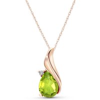 Peridot & Diamond Pendant Necklace handcrafted in rose gold plated 9ct gold. Single 2 ct genuine peridot, single 0.03 ct diamond. Pear cut. The pendant hangs from a rose gold double link rope chain with spring clasp. Size: 7.9 x 17.8 mm (0.31 x 0.7 in). Material: 9ct Rose Gold. Total metal weight: 1.84 gr. 1 pear cut peridot = 2 ct. 1 round brilliant cut diamond (K colour, I3 clarity) = 0.03 ct. Colour: Green. Stone cut: Pear Cut. Anniversary: 16th Anniversary. Birthstone: August.