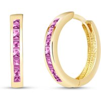 Pink Sapphire Hoop Huggie Earrings handcrafted in 9ct Gold. 14 genuine sapphires, total 1.85 ct for both earrings combined. Princess cut. Size: 3.3 x 19.1 mm (0.13 x 0.75 in). Material: 9ct Gold. Total metal weight: 2.6 gr. 14 princess cut pink sapphires (2.5 x 2.5 mm) = 1.85 ct total for pair. Colour: Pink. Stone cut: Princess Cut. Anniversary: 5th Anniversary, 45th Anniversary. Birthstone: September.