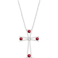 Ruby & Diamond Cross Pendant Necklace handcrafted in solid white gold. Four genuine rubies, total 0.5 ct, single 0.03 ct diamond. Round cut. The pendant hangs from a white gold double link rope chain with spring clasp. Size: 20.3 x 30 mm (0.8 x 1.18 in). Material: 9ct White Gold. Total metal weight: 1.64 gr. 4 round cut rubies (VS1 clarity) = 0.5 ct total. 1 round brilliant cut diamond (H colour, SI2 clarity) = 0.03 ct. Colour: Red. Stone cut: Round Cut. Anniversary: 15th Anniversary, 40th Anniversary. Birthstone: July.